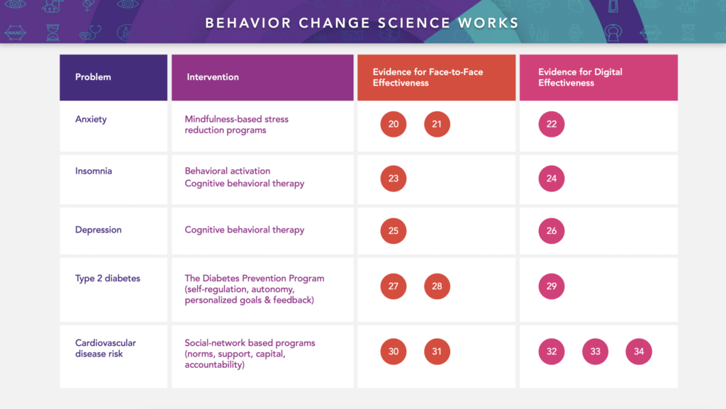 But, what if we helped people before they got sick? What if we could recoup some of that $3.7 trillion, and pump it back into our economy? Lifestyle behaviors drive most chronic disease incidence, morbidity, and mortality. 48 These behaviors include smoking, excessive alcohol consumption, insufficient physical activity, and poor sleep habits. 49 With the help of science, these behaviors can be changed. And while there exists a dizzying number of consumer-facing wellness apps that claim to change these behaviors, very few have published evidence to indicate that they do so in any meaningful way. 50